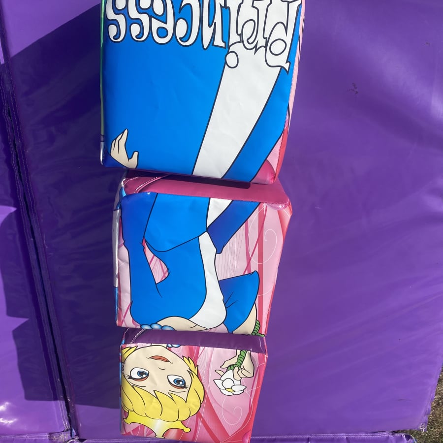 Princess and Unicorn themed soft play package. A combination of two of our most popular themes for bouncy castle parties now available as soft play. Bouncyful Castles has had this product custom made by our manufacture so you wont find it anywhere else, This beautifully printed artwork has friendly Princess one side and playful Unicorns the other. A mix of soft shapes, stacking puzzle cubes, balancing blocks & stepping stones. A fun and entertaining way to learn motor functioning skills.