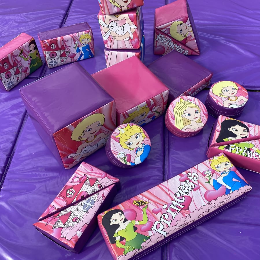 Unicorn and Princess themed soft play package. A combination of two of our most popular themes for bouncy castle parties now available as soft play. Bouncyful Castles has had this product custom made by our manufacture so you wont find it anywhere else, This beautifully printed artwork has friendly Unicorns one side and playful Princess the other. A mix of soft shapes, stacking puzzle cubes, balancing blocks & stepping stones. A fun and entertaining way to learn motor functioning skills.