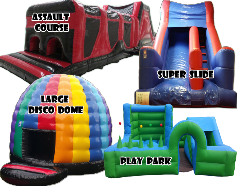 Unbeatable prices, this package is designed for school fairs, charity fundraisers and all types of events, and if you are lucky enough to have a large garden you are also welcome to book for private parties. Both our Large Disco Dome and Assault Course is suitable for children and adults. The Inflatable slide is suitable for children of all ages and our inflatable play enclosure is for pre school aged children only.