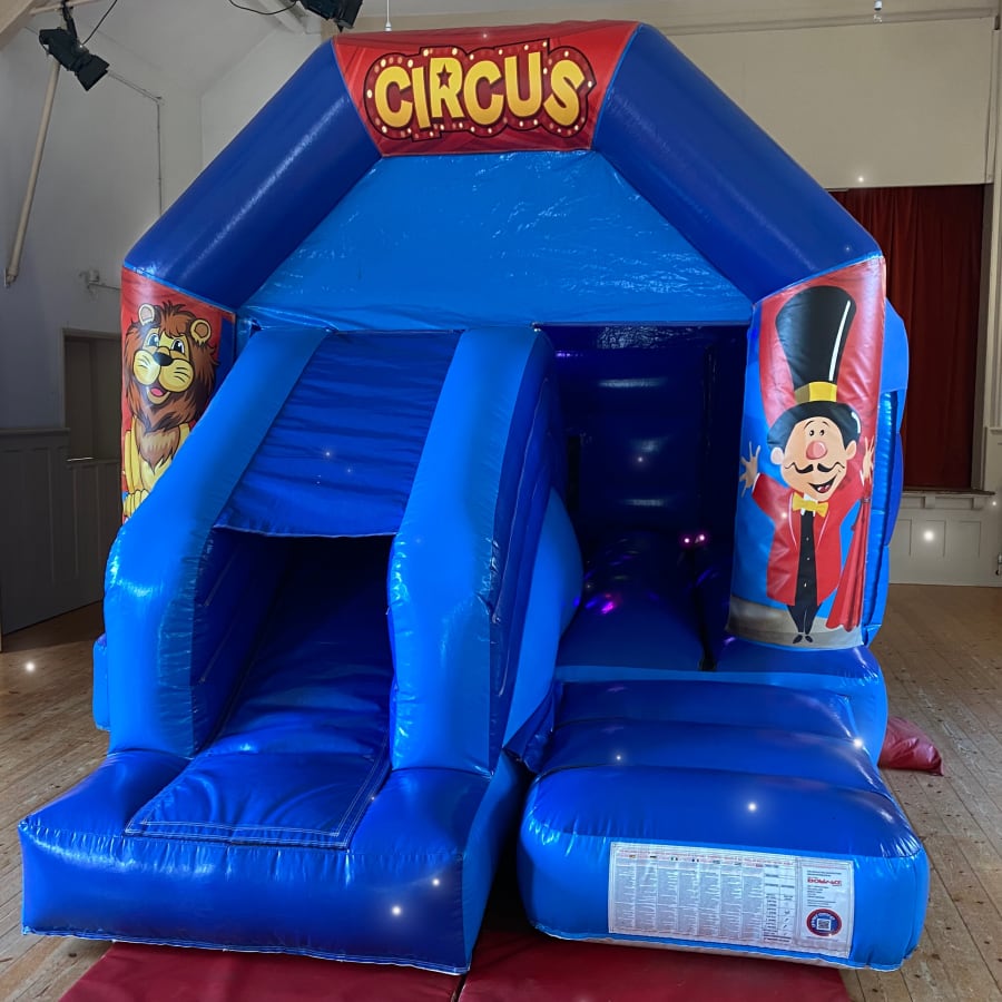 Circus Bouncy Castle with Slide and Disco hire Blue
