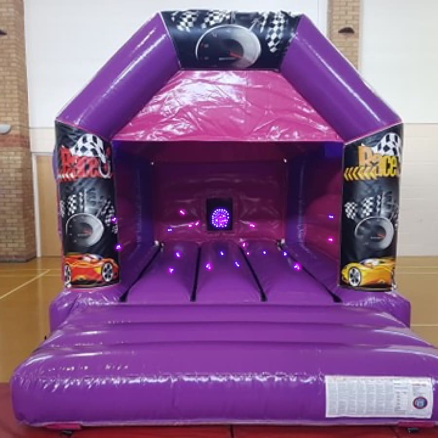A pink and purple bouncy castle with race car Velcro stick on artwork for the front panels. Our jumping castle gives the full party experience with its built in Bluetooth speaker and disco party lights. Not what you are looking for? why not check out our Full hire catalogue
