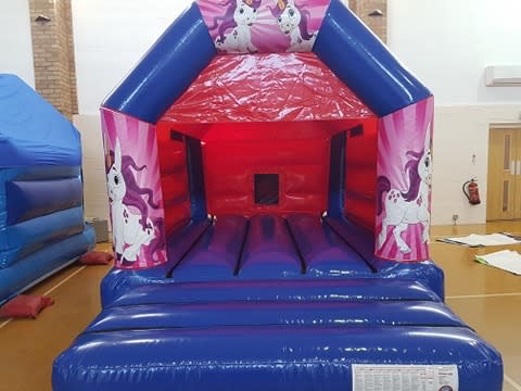 A red and blue bouncy castle with unicorn Velcro stick on artwork for the front entrance panels. Complete with disco lights and a Bluetooth speaker which allows you to play any music from your smartphone. Perfect for keeping kids entertained at any magical children's birthday parties.