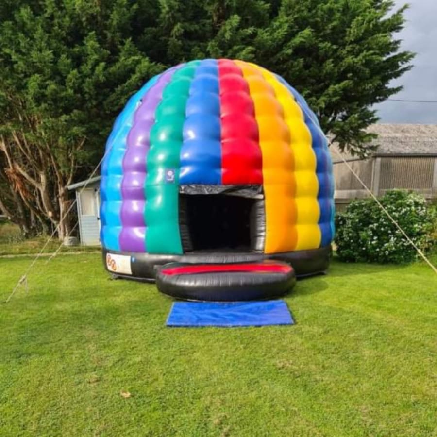 An upgrade from our Medium size dome, this disco inflatable is made with a more water resistant material, helping you to keep dry if it rains on your special day. Perfect for any occasion whatever your age, because our large disco dome is suitable for children, bigger kids and adults too! All of our disco domes come with disco lights and a Bluetooth speaker allowing you to play your own playlist using any smartphone or tablet. Unlike our small and medium domes our large disco dome come with two disco lights. This is a very popular unit, so book now to avoid disappointment!