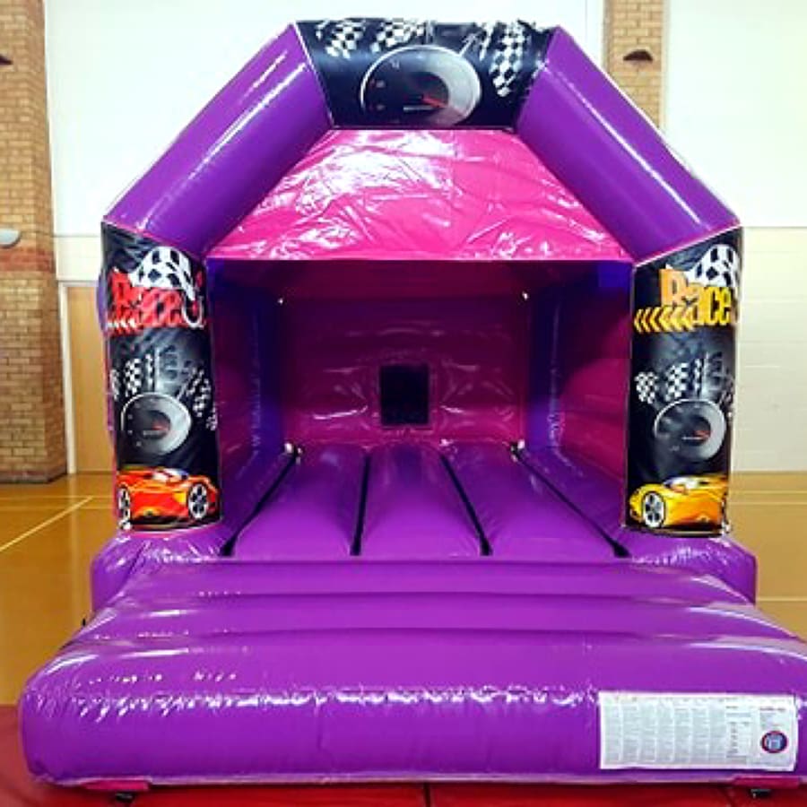 A stunning pink and purple bouncy castle with race car theme artwork on the front entrance. This popular choice of artwork is also available on our blue slide castle, purple slide castle and blue & red bouncy castle. Please note this page is for booking as standard but if you would like to upgrade me to disco! please click here Race Car Disco bouncy castle hire pink & purple