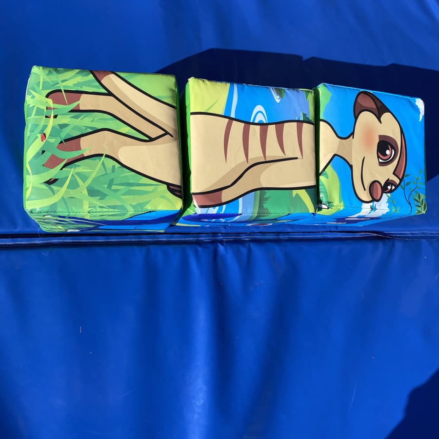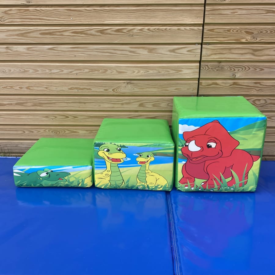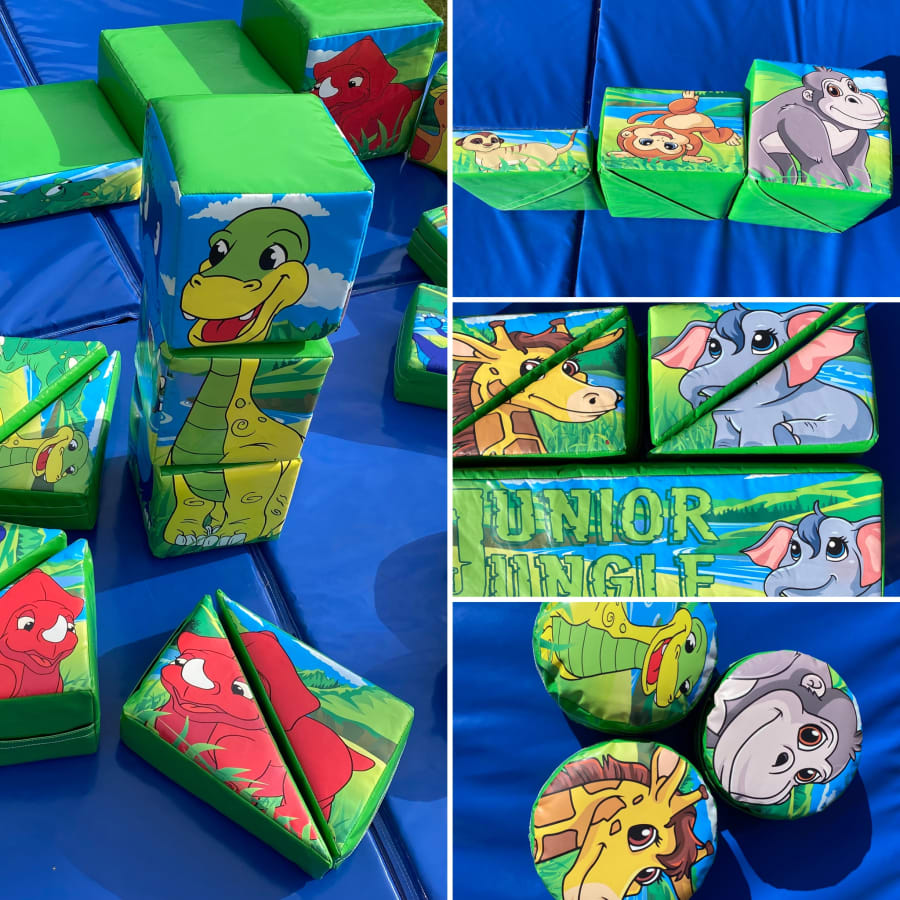 Dinosaur and Jungle themed soft play set. A combination of two of our most popular themes for bouncy castle parties now available as soft play. Bouncyful Castles has had this product custom made by our manufacture so you wont find it anywhere else, This beautifully printed artwork has friendly dinosaur characters one side and playful Jungle the other. A mix of soft shapes, stacking puzzle cubes, balancing blocks & stepping stones. A fun and entertaining way to learn motor functioning skills.