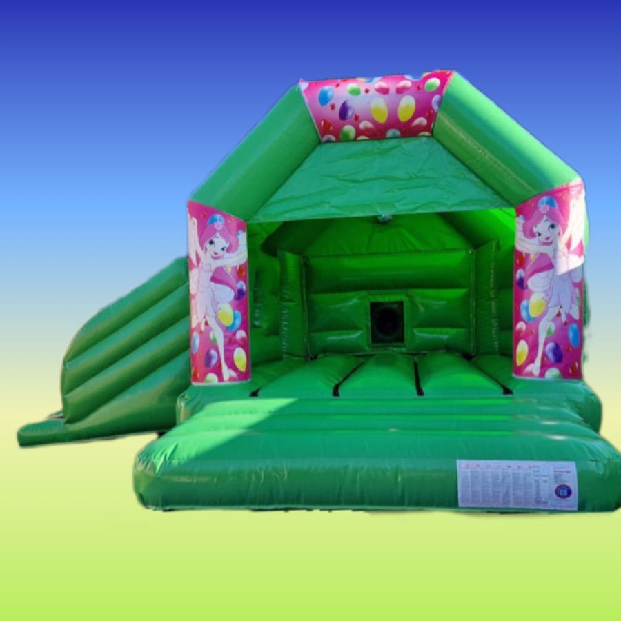 A beautiful green bouncy castle with a slide on the side. Our fairy with balloons slide combo would make a gorgeous additions to any fairy tale or princess fancy dress Birthday party. This page is for ordering bouncy castle only, but if you would like to upgrade me to Disco! by adding disco lights and a speaker click here Fairy Disco Bouncy Castle With Slide Green