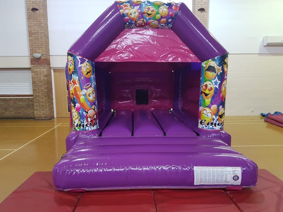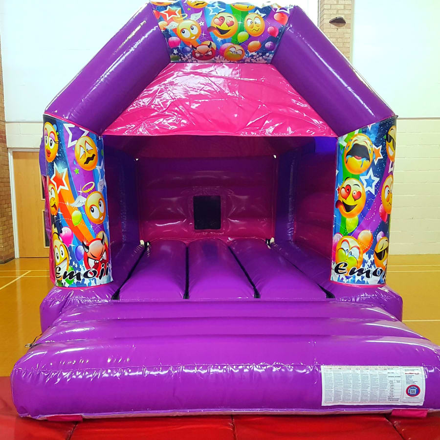 A shiny pink and purple bouncy castle with Emoji theme available for hire. Please note this page is for renting as standard but if you would like to upgrade me to Disco! by adding disco lights and a speaker please click here emoji disco bouncy castle hire pink & purple Our Emoji bouncy castle is frequently hired for lots of different kinds of celebrations and events.