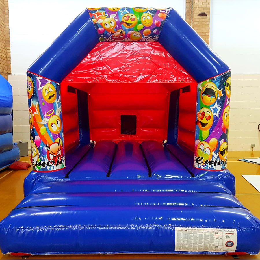 A red and blue shiny bouncy castle available for hire with Emoji theme. All children recognise these little faces and kids will enjoy the fun they bring to any celebration. This page for renting as standard but if you would like to upgrade me to disco! by adding disco lights and a speaker please click here emoji disco bouncy castle hire red & blue