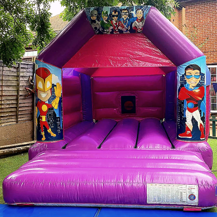 Pretty in pink and ready for a girly superhero party. We also have other superhero bouncy castles in blue, green or purple some with slide too. This page is for booking as standard without disco but if you would like to upgrade me to Disco! by adding disco lights and a Bluetooth speaker please click here Hero Disco bouncy castle hire pink & purple Our Superhero's bouncy castle is frequently hired for lots of different party and events.