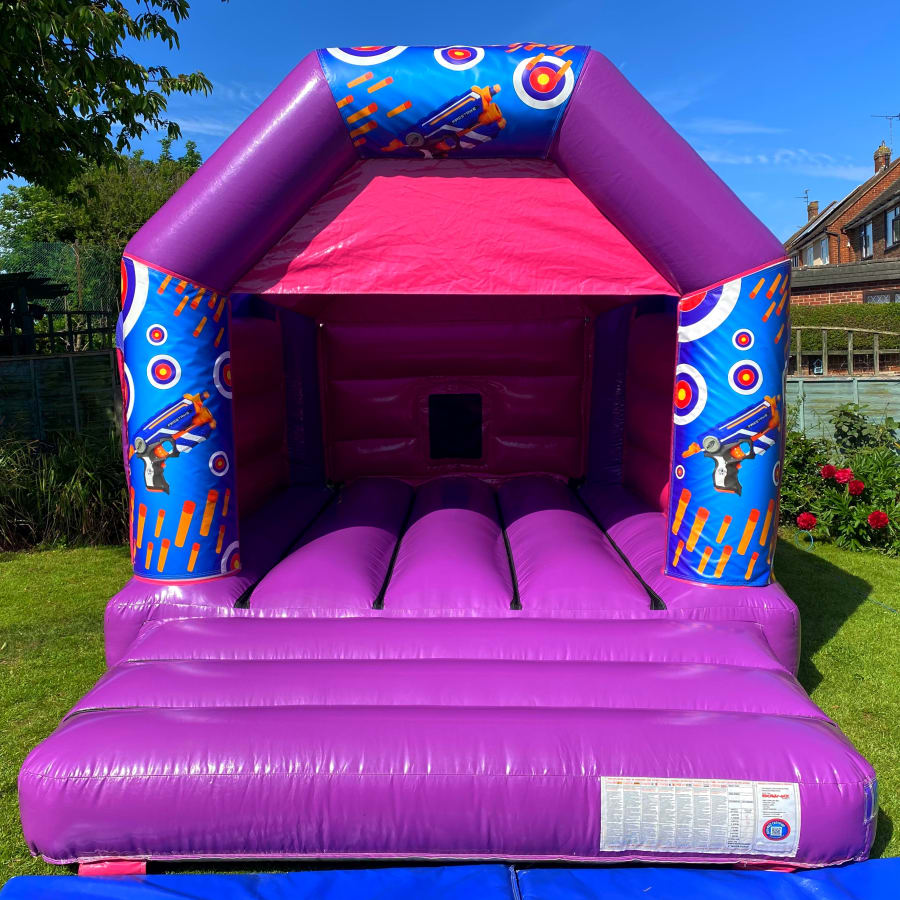 A purple and pink bouncy castle with Nerf theme stick on Velcro artwork on the entrance, Over the years Nerf has become increasingly popular and more recently they released Nerf for girls, a range of pink and purple guns bullets and armour. If your having a Nerf themed Birthday party for girls then this is the right bouncy castle for you. We also have Nerf for boys in Blue. This page is for booking as standard but if you would like to upgrade me to disco! by adding disco lights and a Bluetooth speaker click here Nerf Disco bouncy castle hire pink & purple