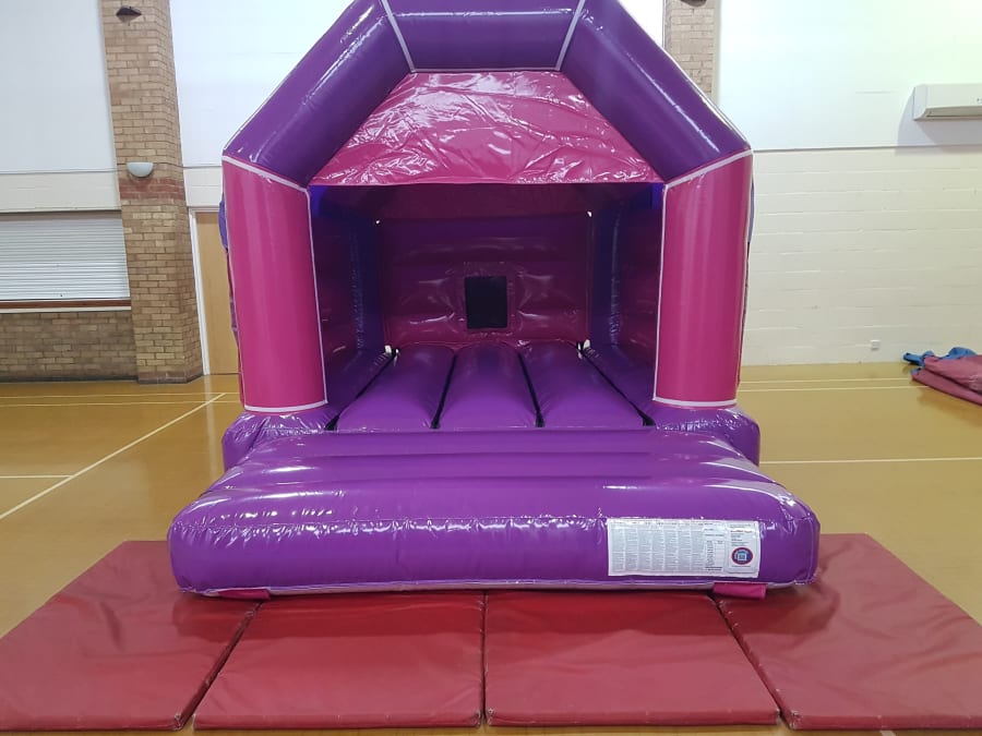 A glossy pink and purple bouncy castle with eye catching circus theme for the front panels. This jumping bouncy house would be perfect for entertaining children at any celebration, it's suitable for both indoor and outdoor use as it's not too big or too small and can fit nicely in many village halls and community centres. However if you are planning a party inside a venue please read the key information regarding size below.