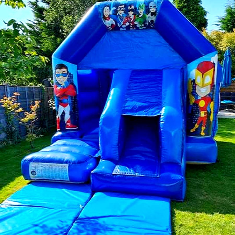 Calling all superhero Mummies and daddies, Make sure you save the day when you order this fantastic superhero bouncy castle with slide. This page is for booking as standard but if you would like to upgrade me to disco! by adding disco lights and a Bluetooth speaker please click here Hero Disco blue front slide