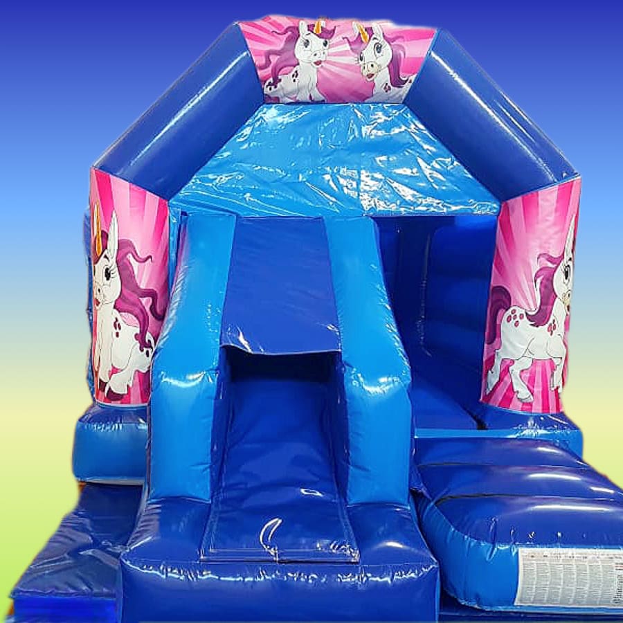 A cool blue bouncy castle with a front facing slide and unicorn themed stick on artwork for the front panels. Perfect if you are looking for a slide combo jumping castle but your garden is too narrow for our side slide castle. This page is for booking as standard but if you would like to upgrade me to disco! by adding disco lights and a Bluetooth speaker please click here Unicorn Disco blue front slide