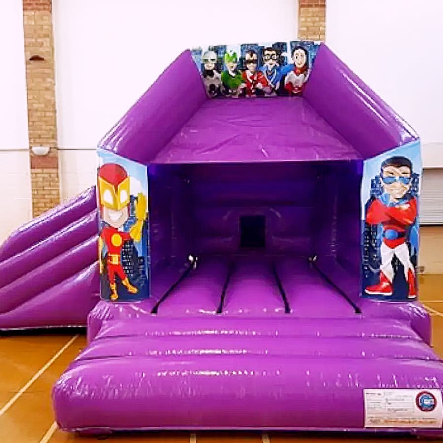 Hero bouncy castle with slide hire purple