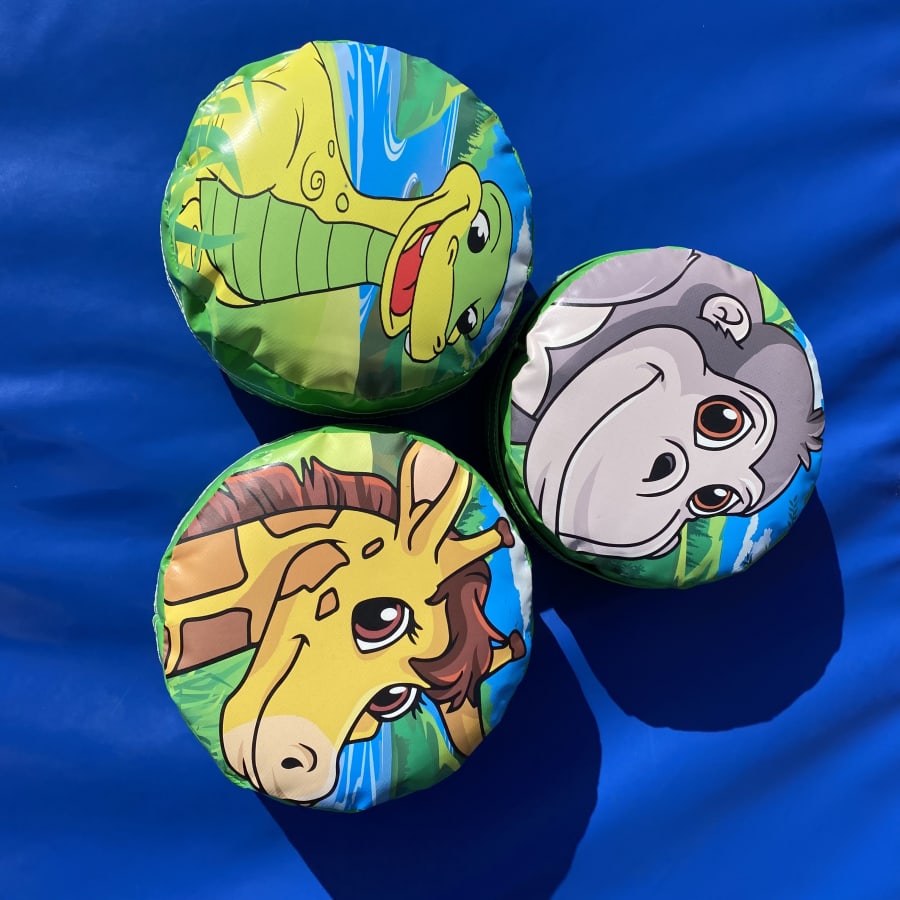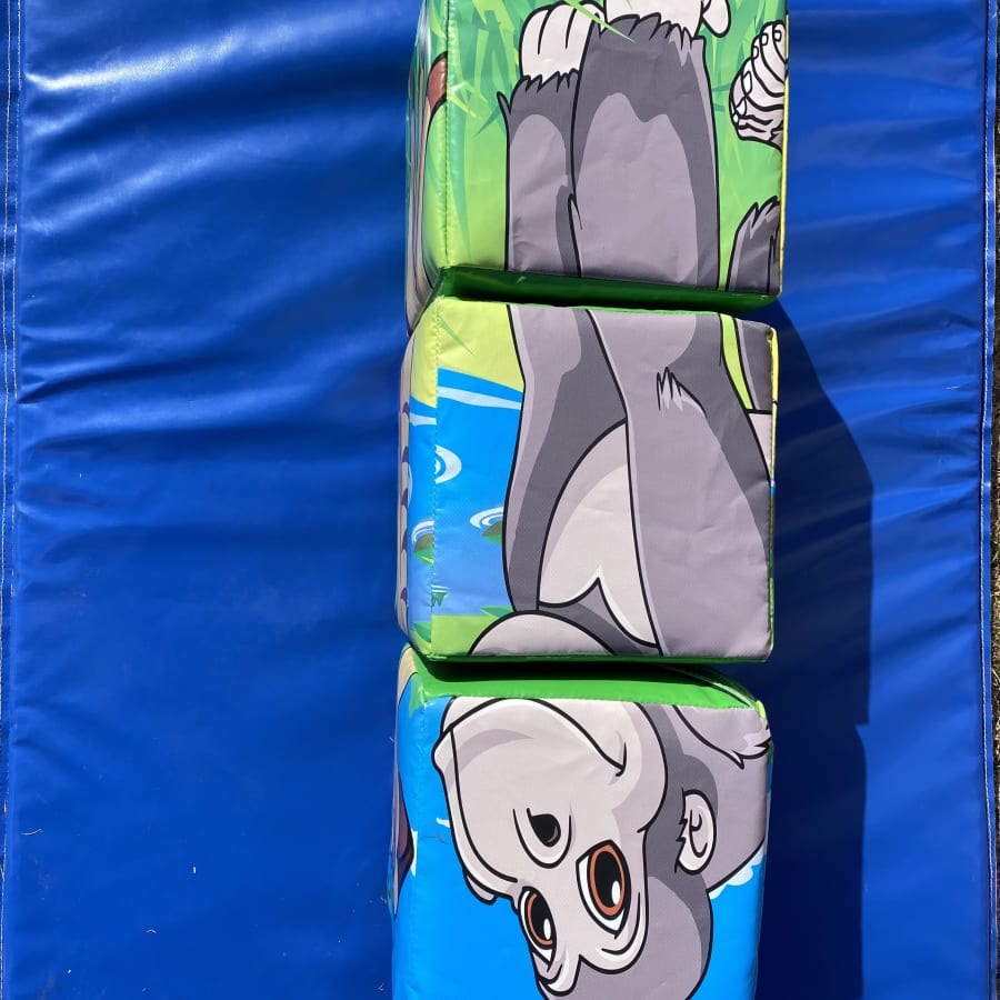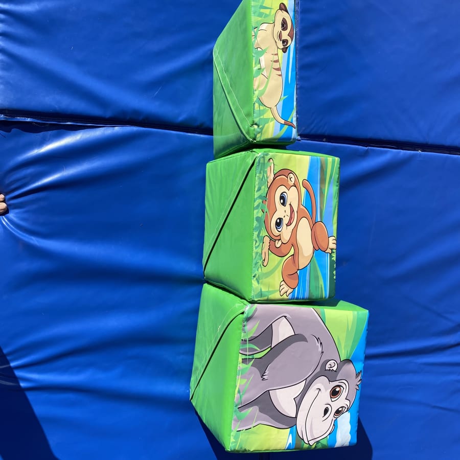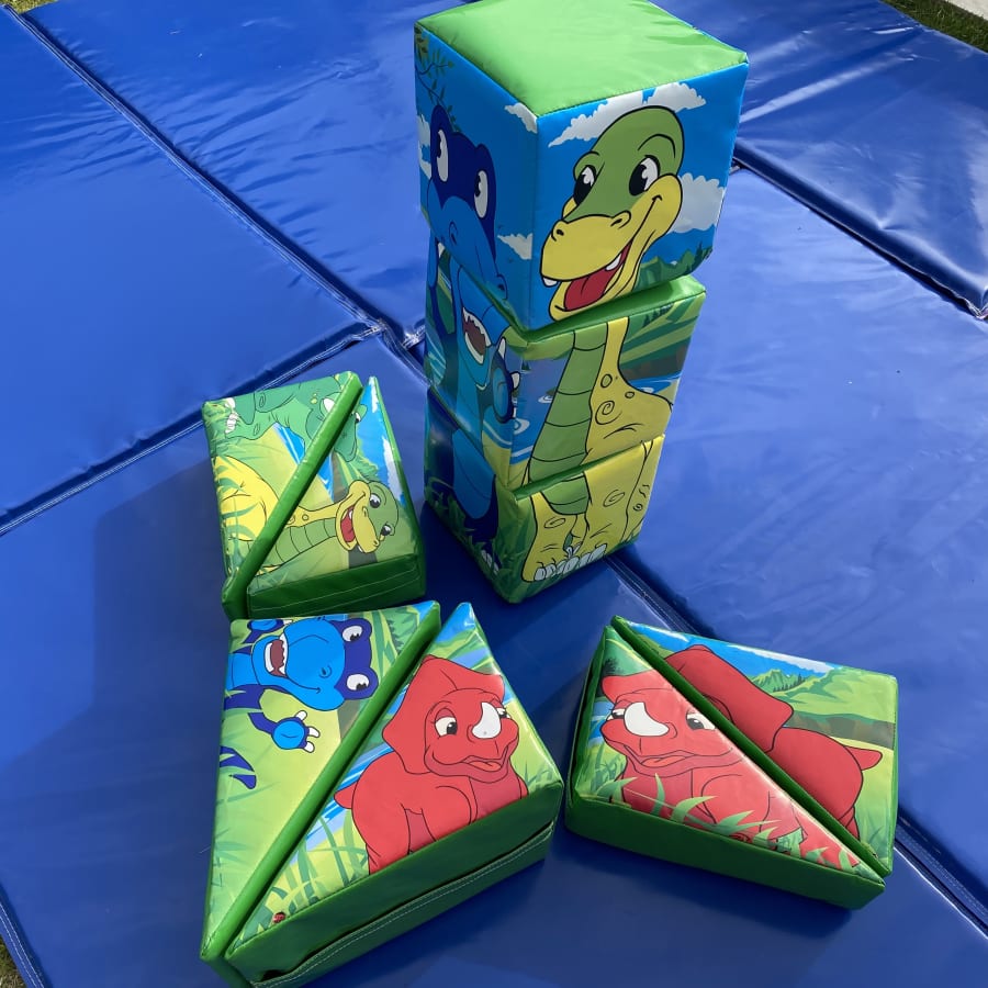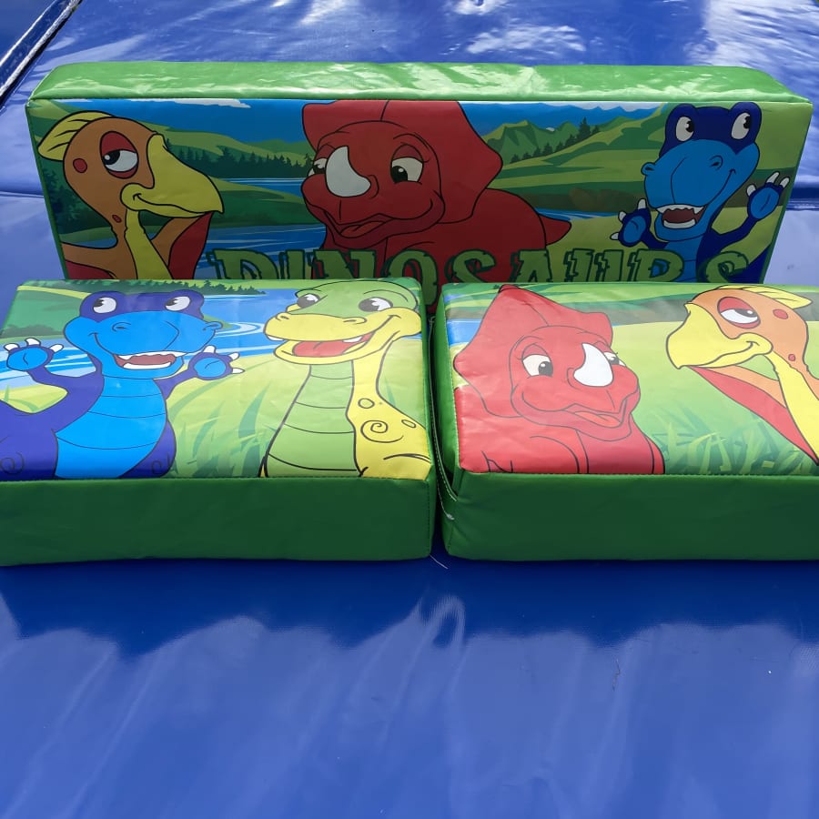 Dinosaur and Jungle themed soft play set. A combination of two of our most popular themes for bouncy castle parties now available as soft play. Bouncyful Castles has had this product custom made by our manufacture so you wont find it anywhere else, This beautifully printed artwork has friendly dinosaur characters one side and playful Jungle the other. A mix of soft shapes, stacking puzzle cubes, balancing blocks & stepping stones. A fun and entertaining way to learn motor functioning skills.
