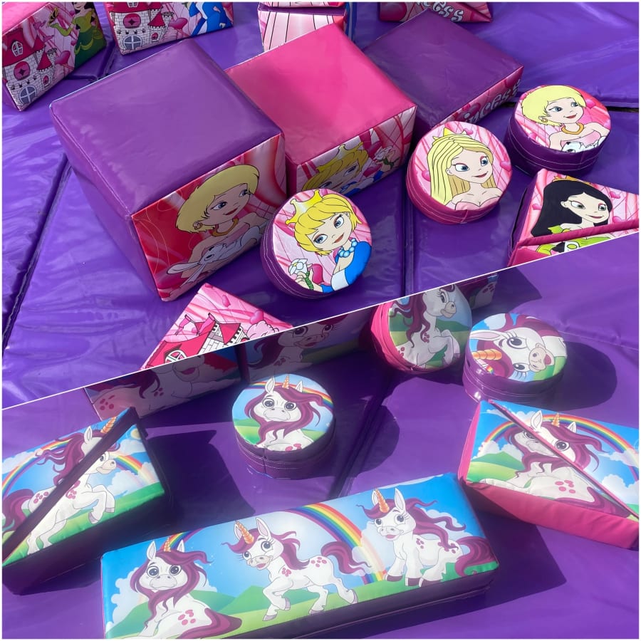 Princess and Unicorn themed soft play set. A combination of two of our most popular themes for bouncy castle parties now available as soft play. Bouncyful Castles has had this product custom made by our manufacture so you wont find it anywhere else, This beautifully printed artwork has friendly Princess characters one side and playful Unicorns the other. A mix of soft shapes, stacking puzzle cubes, balancing blocks & stepping stones. A fun and entertaining way to learn motor functioning skills.