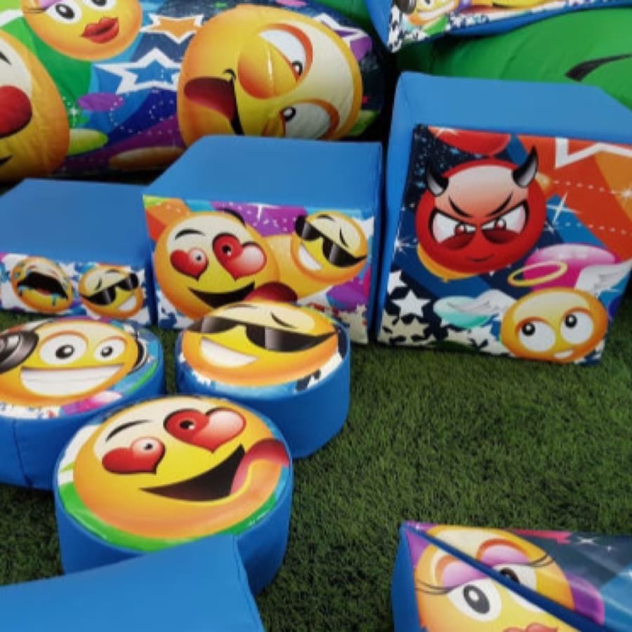 Emoji and Party themed soft play set. A combination of two of our most popular themes for bouncy castle parties now available as soft play. Bouncyful Castles has had this product custom made by our manufacture so you wont find it anywhere else, This beautifully printed artwork has friendly Emoji characters one side and party balloons the other. A mix of soft shapes, stacking puzzle cubes, balancing blocks & stepping stones. A fun and entertaining way to learn motor functioning skills.
