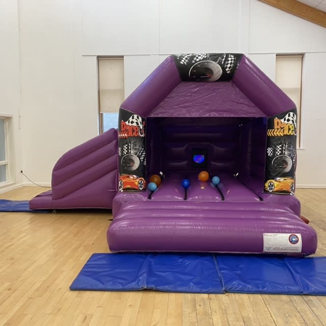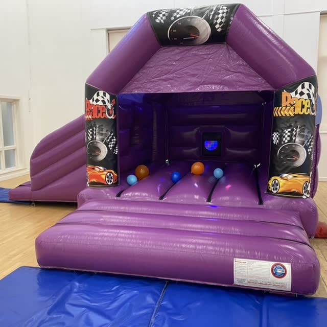 You can now find this purple race cars bouncy castle with slide available to hire in our discounted Party Packages coupled with either our Soft Play Sets, Didi Car Race Track with 8 Didi Cars, Ball Pools or Nerf Target Shoot.