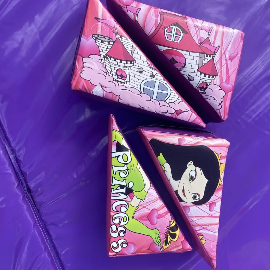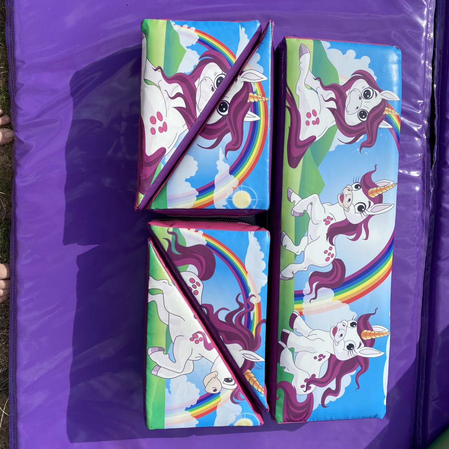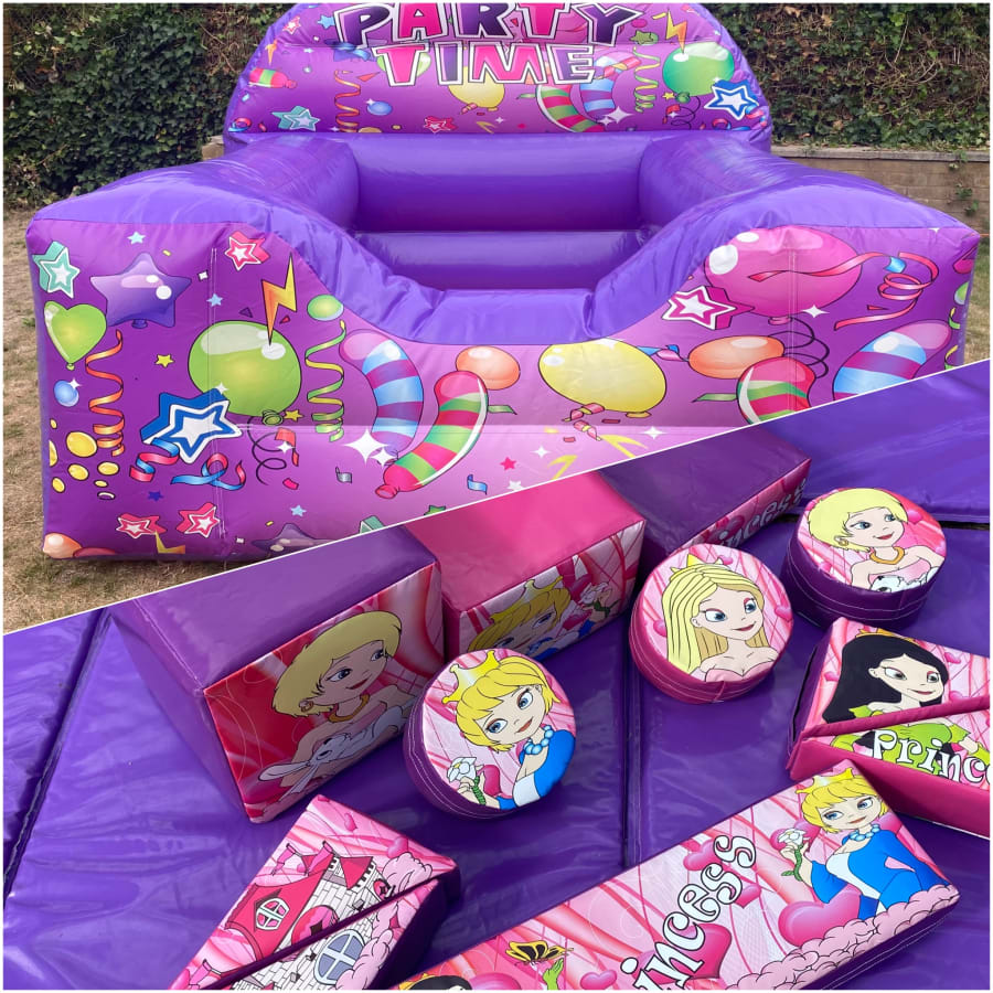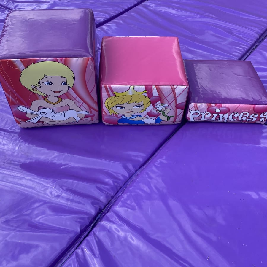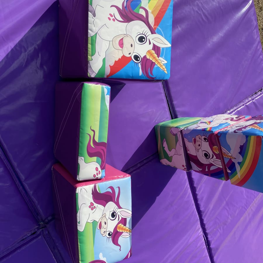 Princess and Unicorn themed soft play package. A combination of two of our most popular themes for bouncy castle parties now available as soft play. Bouncyful Castles has had this product custom made by our manufacture so you wont find it anywhere else, This beautifully printed artwork has friendly Princess one side and playful Unicorns the other. A mix of soft shapes, stacking puzzle cubes, balancing blocks & stepping stones. A fun and entertaining way to learn motor functioning skills.
