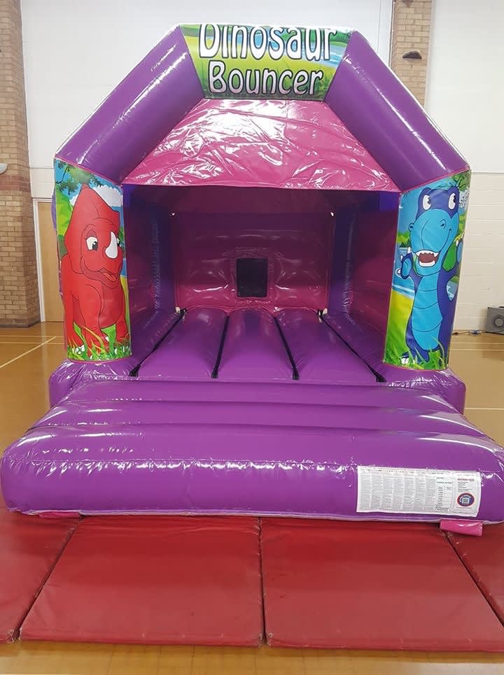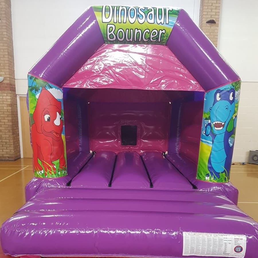 A purple and pink bouncy castle with dinosaur Velcro stick on artwork for the front panels. Our jumping castle gives the full party experience with its built in Bluetooth speaker and disco party lights. Not what you are looking for? why not check out our Full hire catalogue we also have dinosaurs bouncy castle in Green, Red and Blue.