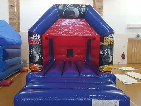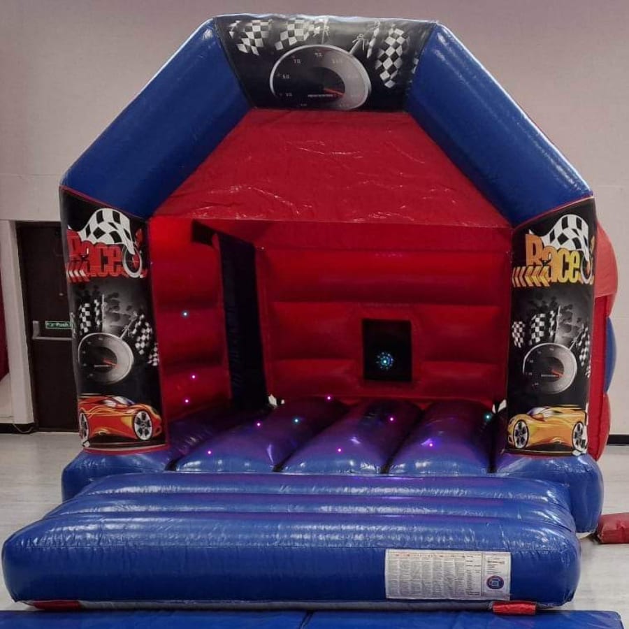 A red and blue bouncy castle with race car Velcro stick on artwork for the front entrance panels. Complete with disco lights and a Bluetooth speaker which allows you to play any music from your smartphone. Perfect for keeping kids entertained at children's birthday parties.