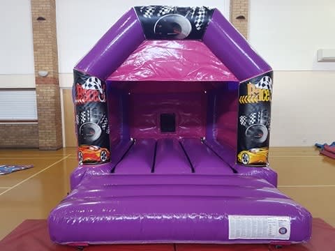 A pink and purple bouncy castle with race car Velcro stick on artwork for the front panels. Our jumping castle gives the full party experience with its built in Bluetooth speaker and disco party lights. Not what you are looking for? why not check out our Full hire catalogue