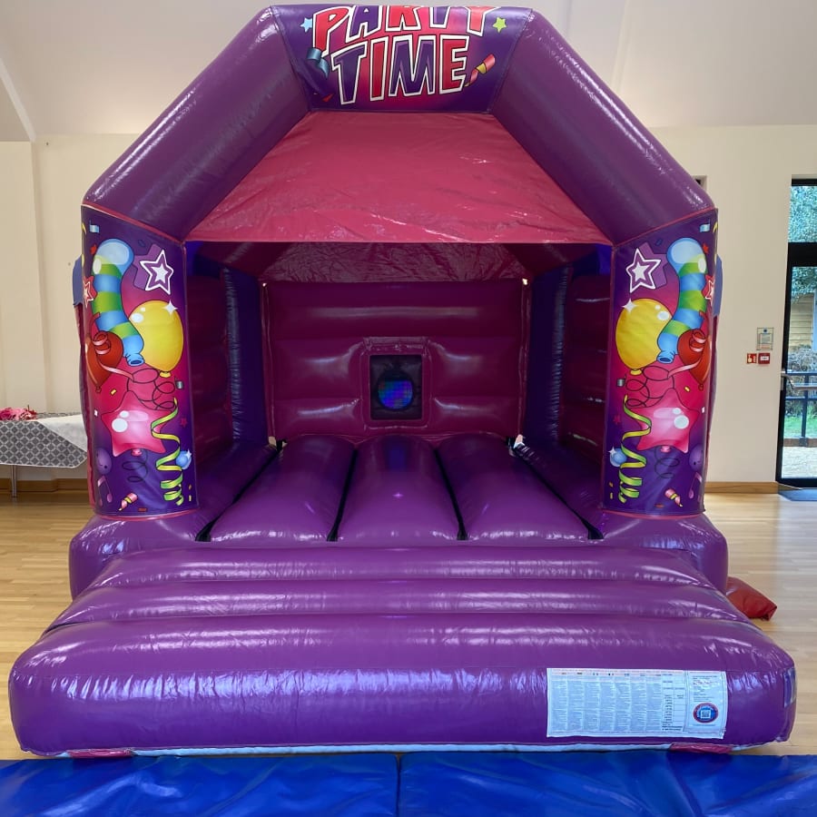 A pink and purple bouncy castle with party time theme Velcro stick on artwork for the front entrance. This bouncy castle would be a fantastic addition to any party or event. Complete with Disco lights and a built in Bluetooth speaker. Children will love jumping, singing and dancing in this beautiful bouncing castle. Not what you are looking for? why not check out our Full hire catalogue