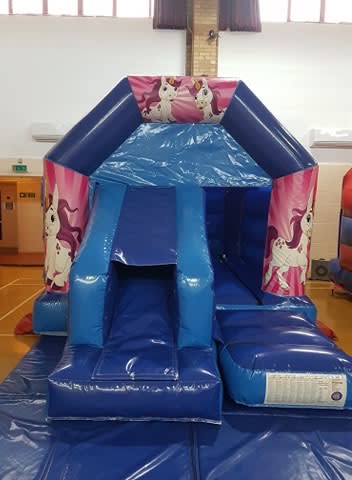 A blue bouncy castles with front facing slide and unicorn themed artwork, disco lights and a Bluetooth speaker which allow you to play any music from your smartphone. Perfect for keeping kids entertained at Children's Birthday parties.